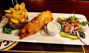 • Fish ’n chips med salt & vinäger samt kall tartarsås /165:-                                                                                                                                                            Fish´n chips på klassisk engelsk vis gjord på färsk kolja